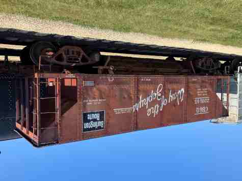 Chicago Burlington and Quincy car ballast 220100, built by American Car & Foundry in 1927, for hauling rock ballast and other aggregate. Very similar to a standard hopper car, ballast cars were designed with doors in the bottom set to dump the car's contents to the side of the tracks.