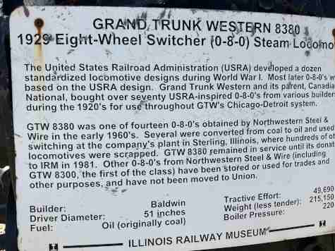 Grand Trunk Western 0-8-0 8380, ex. Northwestern Steel & Wire 80, nee Grand Trunk Western 8380, built by Baldwin Locomotive Works in 1929. In the 1950s it was retired and sold for scrapping but the scrap company instead used it, and several identical engines, for switching their facility. In this capacity it remained in use until 1980, one of the last steam engines in commercial use anywhere in North America.