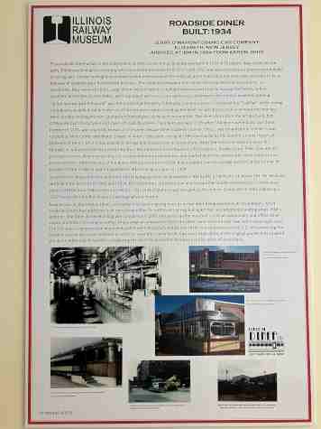 The Central Diner, as it is known as IRM, is a roadside diner built in 1934 by the Jerry O'Mahony Company of Elizabeth, NJ. It was never a railroad car, but was built to imitate the appearance of a railroad coach. It was also designed to be picked up and moved to a new location without damaging the structure. It was located in Salem, Ohio, at the corner of Water and Bowery Streets and was known originally as the Salem DeLuxe Diner (later renamed Joe's Diner). In 1986 it closed and the diner was purchased by the Akron Historical Society. IRM purchased the diner in 1994 and moved it to Union. In 2002 it was installed at its current site at Central Avenue and Depot Street, with a large annex constructed adjacent to it for food service.