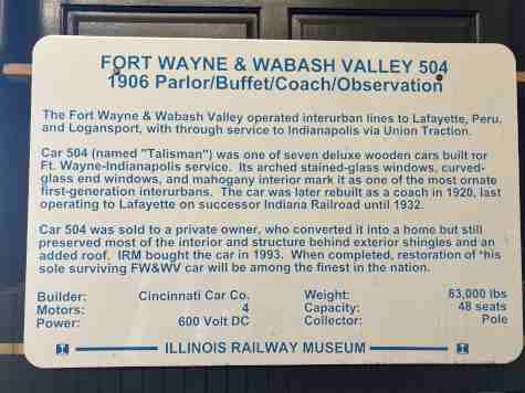 Fort Wayne & Wabash Valley wood-buffet observation car 504 "Talisman", ex. privately owned (house) in Mongo, Indiana 1932-1993, exx. Indiana Railroad 354 1930-1932, exxx. Indiana Service Corporation 354, nee Fort Wayne & Wabash Valley 504 "Talisman", built by Cincinnati Car Company in 1906. It was one of the most opulent interurban cars ever built when constructed and included a baggage compartment, coach seating, buffet for serving snacks and light meals, a parlour seating area and huge curved-glass solarium windows at the rear.