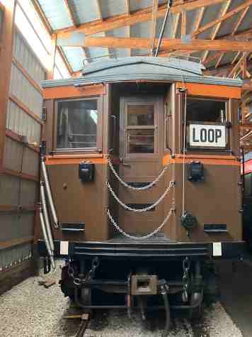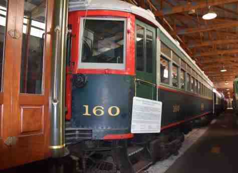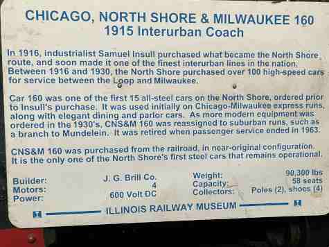 Chicago, North Shore and Milwaukee steel interurban coach 160, nee Chicago and Milwaukee Electric 160, built by J. G. Brill Company in 1915. It is the oldest North Shore passenger car preserved and the only car at IRM from the railroad's first order for steel interurban cars. It saw nearly 50 years of service, remaining in use until the North Shore was abandoned in 1963. It has been restored to its appearance during the 1940s when it was used on the Shore Line between Chicago and Waukegan.