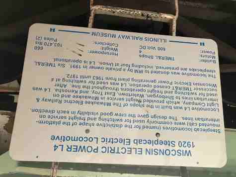 Wisconsin Electric Power steeplecab freight locomotive L4, ex. privately owned in East Troy, Wisconsin 1988-1991, exx. Wisconsin Electric Railway Historical Society in East Troy, Wisconsin 1972-1988, exxx. Wisconsin Electric Power Company 1963-1972, exxxx. Milwaukee Electric Railway and Transport Company 1938-1963, nee Milwaukee Electric Railway & Light Company, built by the company in 1920. At the end of its service life, it was used to switch coal hoppers around the power plant at Port Washington, Wisconsin.