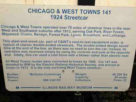 The West Towns had such a marginal electrical distribution system that they chose to heat their streetcars not with electricity but with coal. Car 141 has a coal stove in the middle of the car complete with stovepipe sticking out of the roof.
