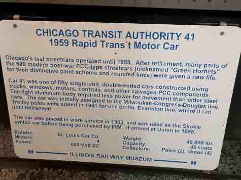 Chicago Transit Authority aluminium PCC-type L car 41, built by St. Louis Car Company in 1959 using recycled components from retired CTA streetcars. It was one of a series of 50 cars that were the last single-unit "L" cars built for Chicago, all later CTA cars being permanently coupled in pairs. Car 41 is restored to its 1990s appearance while in service on the Skokie Swift (now the Yellow Line).