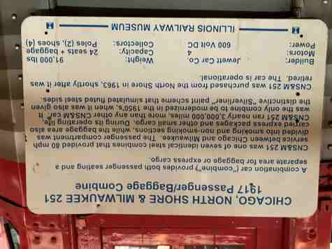 Chicago North Shore and Milwaukee combination passenger-baggage car 251, built by Jewett Car Company in 1917 for high-speed service between Chicago and Milwaukee. Following a wreck, it was put through the railroad's "Silverliner" modernization program, which included upgraded seating and a faux-stainless-steel paint job, the only combine on the railroad to be modernized. It has been completely restored by IRM volunteers to its appearance in the early 1950s.