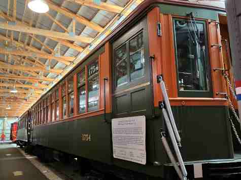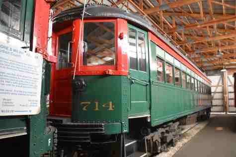 Chicago, North Shore & Milwaukee interurban coach 714, built by Cincinnati Car Company in 1926. It operated until 1963 in daily service, in trains of up to eight cars. Shortly after the railroad abandoned operations, car 714 came to IRM and it has been restored to its 1950s appearance.