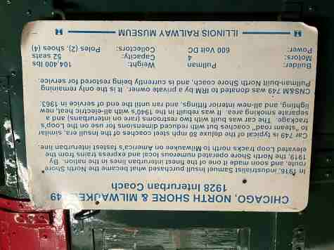 Chicago North Shore and Milwaukee interurban coach 749, built by Pullman/Pullman-Standard in 1928. It is the only car of its series of Pullman-built cars to be preserved and has been completely restored by IRM volunteers to its appearance in the late 1950s.