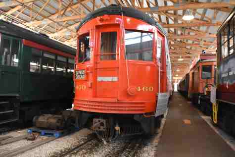 Chicago Aurora and Elgin interurban car 460, ex. Lake Shore Electric Railway in Cleveland, Ohio 2006-2010, exx. Trolleyville USA in North Olmsted, Ohio 1962-2006, nee Chicago Aurora & Elgin 460, built by St. Louis Car Company in 1945. It is the last traditional interurban car built in the United States. The CA&E ordered ten modern curve-side coaches in 1941 but the cars were not completed until 1945 due to World War II. Cars 451-460 featured lightweight design and newer electric control systems, but could be used together with the line's old 1920s steel coaches. Car 460 has been restored to its appearance when the CA&E abandoned passenger service in 1957.