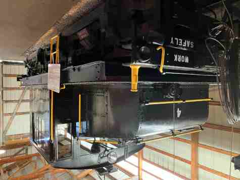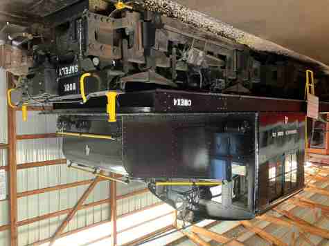 J. Neils Lumber Company three-truck Shay 5, ex. privately owned 1964-1965, exx. Klickitat Log & Lumber Company 5 ?-1964, exxx. St. Regis Paper Company 5 1957-?, J. Neils Lumber Company 5, built by Lima Locomotive Works in 1929. It was designed with three cylinders mounted vertically on the engineer’s side that power a drive shaft running the length of the engine alongside the wheels. This allows all wheels to be powered using bevel gears. Shays were extremely slow but were powerful and could negotiate uneven track and sharp curves, making them popular with logging and mining companies.