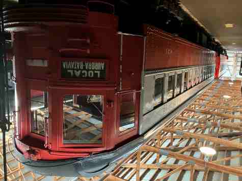 Chicago, Aurora and Elgin heavyweight steel interurban coach 431, built by Cincinnati Car Company in 1927 for high-speed service between Chicago and the Fox River Valley. It has been restored to its appearance in the mid-1950s.
