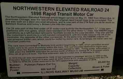Northwestern Elevated Railroad wood gate car 24, ex. Chicago Transit Authority S111 1954-1958, exx. Chicago Transit Authority 1024 1947-1954, exxx. Chicago Rapid Transit 1024 1924-1947, exxxx. Chicago Elevated Railway 1024 1913-1924, nee Northwestern Elevated Railroad 24, built by Pullman in 1898 with open platforms with gates rather than enclosed ends with doors. It also has longitudinal seating, known as a bowling alley arrangement.