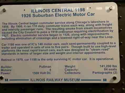 Illinois Central steel commuter coach 1198, built by Pullman/Pullman-Standard in 1926. When new, it replaced aged steam locomotives on the suburban line south of Chicago and was always coupled to an unpowered trailer car to create a two-car motor-trailer set. It the only preserved motor car from the original electrification of the Illinois Central commuter line, today's Metra Electric.