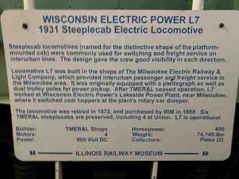 Wisconsin Electric Power steeplecab locomotive L7, ex. Wisconsin Electric Railway Historical Society in East Troy, Wisconsin 1972-1988, exx. Wisconsin Electric Power Company L7 1963-1972, exxx. Milwaukee Electric Railway and Transport Company L7, nee Milwaukee Electric Railway & Light Company L7, built by the company in 1931 in their Cold Spring Shops to haul freight trains on the Wisconsin interurban network. At the end of its service life, it was used to switch coal hoppers around the power plant at Port Washington, Wisconsin.