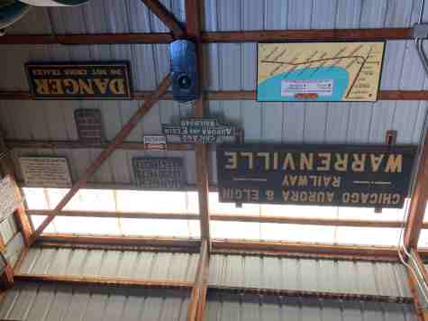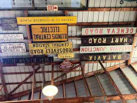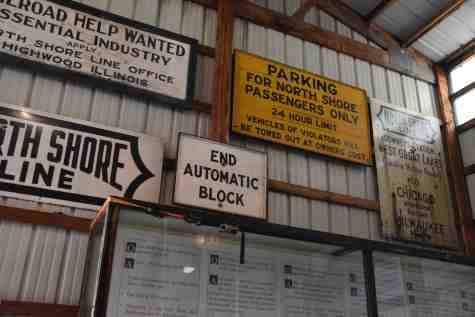 A variety of electric railway signs on the wall as we exited. Lunch was set up at the pavilion, consisting of make-your-own sandwich with potato salad and baked beans, as well as dessert. Fortified, we continued exploring.