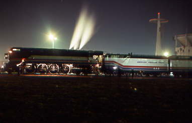 January 1976 - Southern Pacific 4449 resting at night with the Big A standing guard behind.