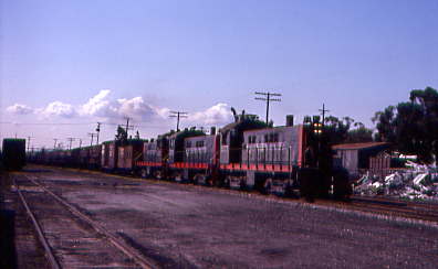 1976 -- Southern Pacific S6's 1277, 1272 and 1271 pull an empty sugar beet train back to Anaheim where the road power would be added for the journey to the Imperial Valley.