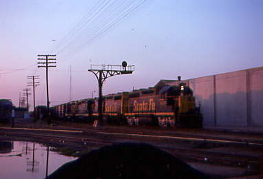 1973 -- Santa Fe U36C 8706, built by General Electric in 1972, rounded the curve at Santa Ana. It was wrecked at Hereford, Texas in 1981 and scrapped.