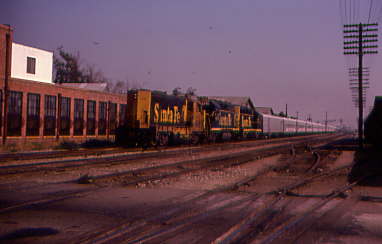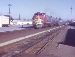 Amtrak 3 the Southwest Chief rerouted on January 1st due to the Rose Bowl Parade in Pasadena rolls west through Fullerton in 1984.