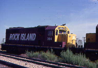 Chicago, Rock Island and Pacific GP40 384, built by Electro-Motive Division in 1969. It would later become New Jersey Transit 4138, then San Luis and Rio Grande 4138. It is currently San Luis and Rio Grande 1921 and painted in an Adams State University livery.