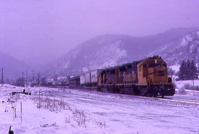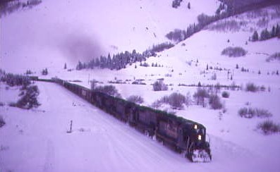 We caught Rio Grande 5351 East with four Missouri Pacific SD40-2's in the consist then further northwest, crossed the summit of Tennessee Pass and started our descent. Bill decided to switch gears then we hit an ice patch and spun out into a snow bank. As we were trying to work out how to remove the vehicle, a Denver and Rio Grande Western signal maintainer drove up and offered to pull us out using the wrench on his truck. He freed us with no problem and after thanking him, we proceeded to Minturn, checking in at the railroad's offices to learn there was an eastbound on its way, so started off in search of the train.