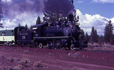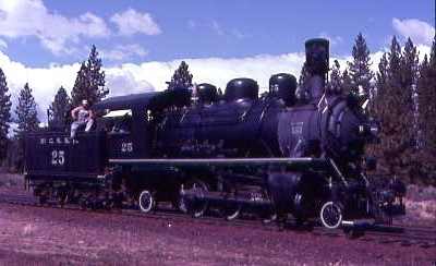 Jeff and I walked down to the engine house and found McCloud River Railroad 2-6-2 25, built by American Locmotive Company in 1925, slowly reversing out into the clear morning sun with only a few clouds hanging over the mountain in the distance. After leading the 1955 Gold Spike Excursion marking completing the Burney extension, it was retired and stored until the early 1960's when it was restored for passenger excursions that lasted from 1962-1975, 1982-1986, 1997-2001 and a few trips in 2008. Between 1988 and 1997, it was leased to Great Western Railway Museum then re-acquired by McCloud River Railroad before being sold to the Oregon Coast Scenic Railroad.