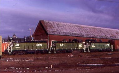 Burlington Northern NW-2 569 (nee Chicago, Burlington and Quincy 9411B, built by Electro-Motive Division in 1949), 571 (nee Chicago, Burlington and Quincy 9412B, built by Electro-Motive Division in 1949) and 570 (nee Chicago, Burlington and Quincy 9412A, built by Electro-Motive Division in 1949) greeted us.