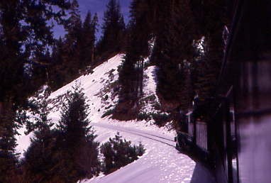 We reboarded and travelled around the south end of the wye on our way to Obie then crossed State Highway 89 and started to climb the grade as the snow became even more deep. We ascended into the forest curving our way to Curtis, MP B-25, then rounded a series of tight horseshoe curves before arriving at Obie, MP B-31, but the train pulled down to the junction of the Pondosa Spur, MP P-34.