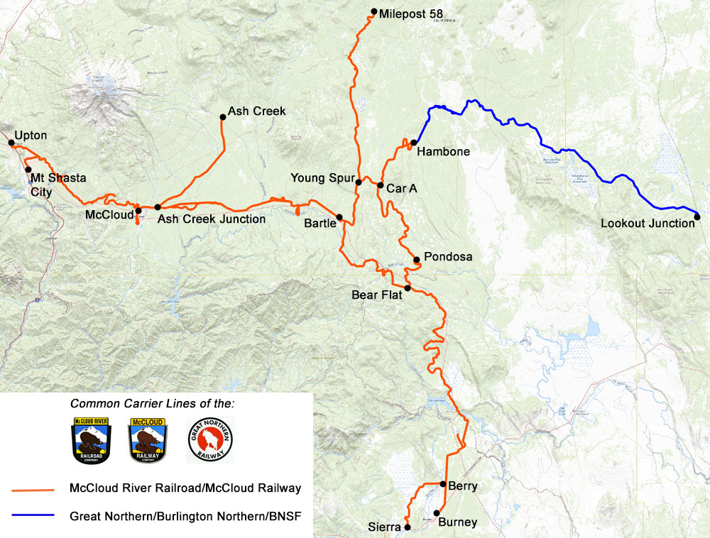 In 1955, McCloud extended the former PG&E line south to Burney and upon reaching there, McCloud operated a 130 mile, railroad including trackage rights over the 34 mile Great Northern Hambone branch. The railroad remained primarily a logging railroad with several different owners over the following years including: U.S. Plywood Corporation (1963), U.S. Plywood-Champion Papers (1969), Champion International (1972) and Itel Corporation (1977), until the railroad officially ceased logging operations in 1979. It was then sold to Jeff E. and Verline Forbis (4-Rails, Inc.) on July 1, 1992.