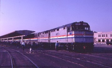 It was a bright Sunday morning as my friend Cindy Piehl and I drove to Los Angeles Union Station for this excursion utilizing the equipment from the Sunset Limited pool that laid over in Los Angeles, since that train is tri- weekly. We parked and entered the grand building, walking to the gate where we met the rest of the passengers then all of us went down the long tunnel and up the ramp to the track where we found our Santa Fe hi-level coach in this fourteen-car consist. After settling in, the excursion departed on the advertised and made its way to Mission Tower, where we crossed the Los Angeles River to the route that travelled in the middle of the San Bernardino Freeway. While this was the Sunset Limited's normal route, its late evening departure meant that regular commuters were not aware that passenger trains used this route. As such, our passage created many strange and surprised looks on the drivers' faces.
