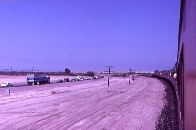 For the chasers, some good news was that the border checkpoint was closed and I was thoroughly into the whole atmosphere as we continued along the sea, passing Frink siding then rounded a large "S" curve to Bertram and crossed Salt Creek to Ferrum, the connection to the Eagle Mountain Railroad.