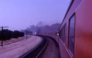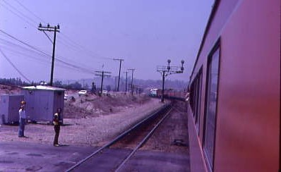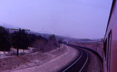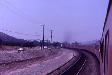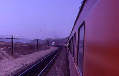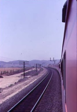 The train departed on time and our group took over the Sightseer Lounge car. I enjoyed an evening of drinking and sharing railroad stories with my newly-found friends as we travelled via the Alhambra trench, much to everyone's liking. Conversations were briefly halted at Pomona when we saw the deplorable condition of the station building there, but returned to high spirits as we continued east through Southern Pacific's West Colton Yard and then interests turned to the train's passage by Colton Tower. We twisted and turned to climb up San Timoteo Canyon where we met three opposing freight trains, then as the Sunset Limited crested the grade at Apex, I returned to my seat and fell asleep.