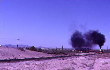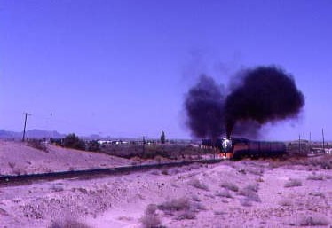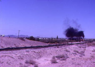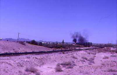 Extra 4449 West made an unexplained stop on this single tracked railroad and I went to an open vestibule to find we were stopped at a red signal. However, it was not the regular searchlight type, but instead an upper quadrant semaphore, a strange sight indeed to see a steam train semaphore signal in the 1980's. It turned out that we had to stop due to the red signal and after a call to the dispatcher from our engineer, we were allowed to continue on our journey. The train's route had been following the Salt River down its valley to the west with the sidings of Dixie, Arlington, Gillespie, Saddle, Hyder and Kofa and we passed each of them with no more delays. We were out in true Sonoran Desert with little traces of man except for the two ribbons of steel upon which our train was riding.