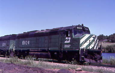 Burlington Northern F45 6624, built by Electro-Motive Division in 1970 was being used in helper service. It was retired in August 1985.