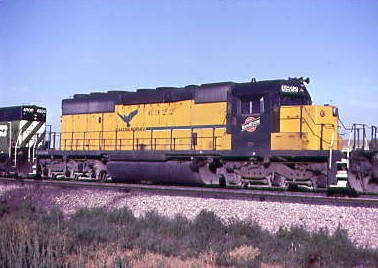 In full Eagle paint was Missouri Pacific SD40 3160, nee Chicago and Eastern Illinois 3160, built by Electro-Motive Division in 1974. It later bcame Union Pacific 9908.