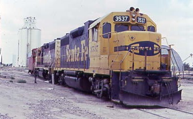 A Santa Fe local in Scott City, Kansas, led by GP38 3537, built by Electro-Motive Division in 1970. It later became BNSF 2227 and is currently BNSF GP39-3 2568.