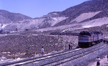The crew ran the locomotives around the train before they let us off for a short look around. Once back on board, we returned the way we came, but a photo runby was done at the Mojave River Bridge. We returned over Cajon Pass down the 3.3 percent grade and at San Bernardino, went the short way, therefore bypassing "B" yard and returning to Fullerton on schedule, ending a most interesting and rare excursion. A special thanks to the Pacific Railroad Society for another excellent trip.