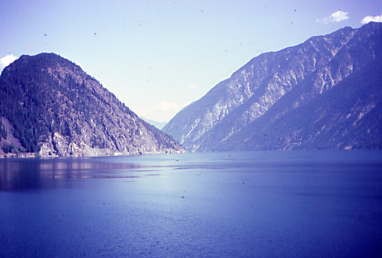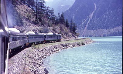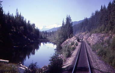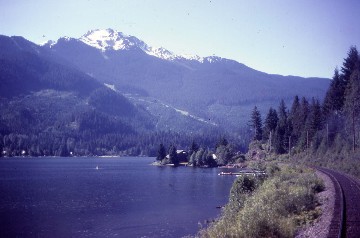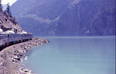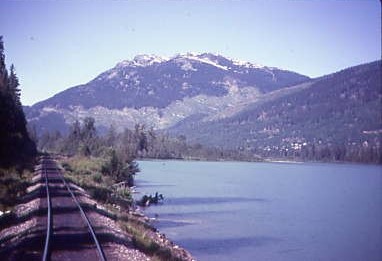 I wished I could obtain a copy of that film to show people the beauty through which this train runs, and I was in the middle of it in the vestibule right. To the left was Mount McLean and across the lake was the Cayoosh Range. We passed the community of Shalath, from which BC Rail ran a school train to Lillooet from 1979 to 2002, which the children named "Budd Wiser". Seton Lake was as deep as Anderson Lake and BC Rail has had several derailments, putting locomotives into the lake followed by a very costly savage operation to retrieve them and in a few cases, rebuild them.