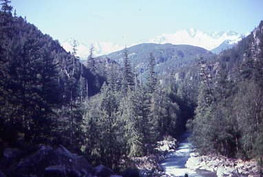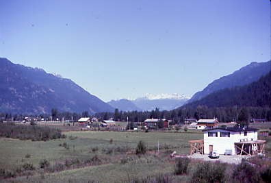 A view of the Pemberton Valley. At Pemberton, we dropped off Vancouver newspapers for the local townsfolk and crossed the Lillooet River sixty miles from the District with the same name. The Lillooet River flows southeast out of the Coast Range and joins the Fraser River near Chilliwack. From Pemberton it was another climb, this one up to Birken, the summit of the Cascade Range and one of the last helper districts on the railway.