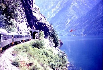 By coincidence, this was the day that BC Rail hired a helicopter to film their passenger service. We plunged into a short tunnel and there was a helicopter photographing our train before flying in front of us as we passed and it was really interesting to watch the pilot manoeuver his aircraft and the whole event was entertaining. This glaciated valley is in a "U" shape and we crossed the remains of the landslide before we started to parallel Seton Lake then entered a 2,940 foot tunnel at MP 125.6 and emerged hugging the shoreline of Seton Lake, which had a milky blue-green colour to it and with our shore running, the helicopter continued to photograph us.
