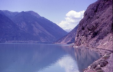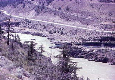 Our passage along along Seton Lake. At the north end of the lake, we passed the Seton Canal, a diversion of the flow of the Seton River from Seton Dam, just below the flow of Seton Lake, to the Seton Powerhouse on the Fraser River at Lillooet. The canal bridges Cayoosh Creek 984 feet below its commencement and is about 2.17 miles in length, ending just below a bridge used by the Texas Creek Road, where the canal's waterflow is fed into tunnels which feed the Seton Powerhouse on the farther side of a small rocky hill. Most of the water carried by the canal is the volume of the diverted Bridge River, which is fed into Seton Lake via BC Hydro's Bridge River generating stations at Shalalth, which are supplied by diversion tunnels through Mission Ridge from Carpenter Lake, the reservoir created by Terzaghi Dam. There is also a fish ladder so the salmon can return to spawn.