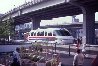 A view of the grounds with the Monorail running overhead. That was the only transportation system that touched every Zone and to allow as many rides as possible, passenger travel was restricted to half way around the 3.47 mile route. After the fair, the city originally planned to keep the monorail as a shuttle service between the beaches of English Bay and Downtown, but after much protest from the surrounding neighbourhoods (who feared that the monorail would make too much noise) the plan was scraped and the monorail was sold. It now shuttles people to and from the parking lot in Alton Towers Amusement Park, England.