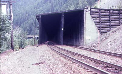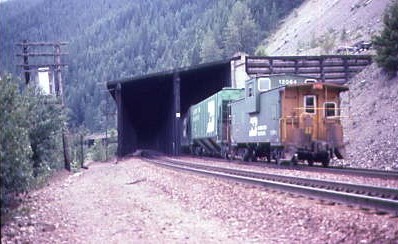 Back on single track, the train dove into a long tunnel under US 2 for the last time for a while and passed the tiny community of Pinnacle, where east of here, on a ledge, the railroad returned to double track. We passed the ballast pit where Burlington Northern was busy making a ballast train since the summer months are the time of heavy maintenance. Further east, we passed the yard at Essex, the helper terminal and then the Izaak Walton Inn, where I would be staying tonight. We rounded the corner and rolled past the Amtrak stop at Essex, one of the few flag stops on the Amtrak system, but since there were no passengers detraining or entraining, we continued on, rounded a curve and entered the first snowshed of the morning located high above the Middle Fork of the Flathead River.