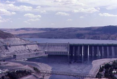 Across the river was Hood River, Oregon which afforded another good view of Mount Hood, after which we rounded the large bend in the river to our next stop at Bingen-White Salmon, then about twenty minutes east of there, we passed The Dalles Dam with its navigational locks along the shore and as luck had it, there was a boat being raised to continue its journey up the Columbia River. The dam itself had twenty-two generators and sent power to places as far away as Los Angeles. Further east at Wishram, we came to the Fallbridge wye with the railroad bridge over the Columbia River. This line was known as the Inside Gateway and was Great Northern's link to Northern California. James J. Hill, founder of the Great Northern, dreamt of having a line to California and this line became it.
