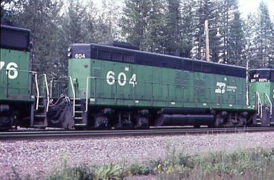 Burlington Northern GP9B 604 1982, ex. Burlington Northern 604, ex. Burlington Northern 1818 1970, ex. Great Northern 1703, nee Great Northern GP9 666, built by Electro-Motive Division in 1954. It later became BNSF 1703 then was retired. It was one of only four GP9bs on the system.