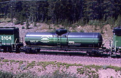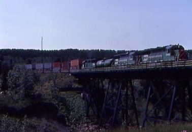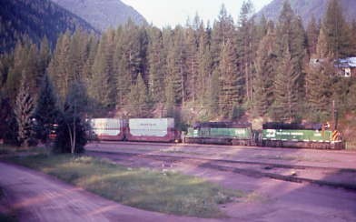 The peaks gave way to hills as the train started to descend the east side of Marias Pass which was quite tame compared to the west slope. The main difference is that you can see the whole range of peaks that makes up the summit of the Rockies. The peaks had glaciers on them, hence the name Glacier National Park, We rolled to the next siding at Bison to find Burlington Northern's hottest piggyback train cooling its heels waiting for us to pass. The foreground scenery was less impressive than the background scenery, which was awe-inspiring since the trees were stunted in their growth from the extremely powerful wind which comes off the mountains. We wound our way down to our next stop, the log cabin depot at East Glacier, built by the Great Northern, which was instrumental in not only bringing people to the park, but also taking care of them once they arrived.