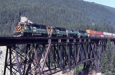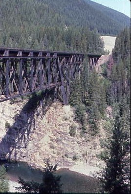 We passed over the Sheep Creek Trestle and across the river in the park was Goat Lick, a natural salt deposit, to which mountain goats are partial to, and of course, the Great Northern used a mountain goat as their mascot, naming him "Rocky". The double track ended at West Java and the tracks ran on a ledge high above the river protected by a slide detector fence since the mountain here is very unstable and could not take a double-tracked main line along its base. We passed through some trees then out onto the high bridge at Java over the Flathead River before we crossed over US Highway 2 with the railroad now becoming the southern boundary of Glacier National Park.