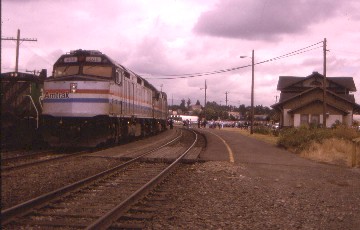 Coast Starlight 11 7/24/1996We boarded and once the train started its journey, Jeff and I went to the lounge car, starting out on the left side in the hopes of seeing Mount Rainier, which we did. Once we reached Tacoma, we switched sides for the ride along the southern end of Puget Sound and stayed there all the way to Chehalis, where we once again switched sides, this time hoping for and receiving a view of Mount St. Helens. We returned to the right side for Cowlitz River and what the ash flow from the 1980 eruption of Mount St. Helens did to it. South of Kelso-Longview, we joined the Columbia River and after Vancouver, crossed the Columbia River into Oregon and travelled along the waterfront and Portland Terminal Railroad's yards before arriving at Portland Union Station. We all walked into a very nice station to wait for our next train and while we did so, the northbound Coast Starlight and Pioneer came through on the last legs of their journeys to Seattle.