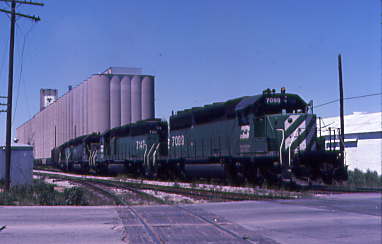Burlington Northern 7099 East in front of huge grain elevator at Saginaw.