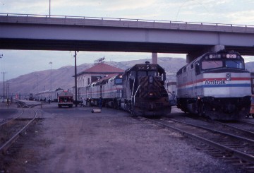 7/13/1990 I awoke just before Salt Lake City and found we were running thirty minutes early so dressed and detrained upon arrival. With an hour to spare, I walked through the depot to the park where Union Pacific 4-8-4 838 was on display then upon my return, saw our car being put on the rear of the California Zephyr, but there was no sign of the Pioneer. Our dining car staff, led by the steward, came up to sadly inform me that they were going to Seattle and to have a safe trip. I asked the conductor what happened to the Pioneer and he told me that it had been behind a freight train derailment and lost about three hours so instead of holding us in Salt Lake City, they would run via Wyoming and should be in Denver waiting for us when we arrive tonight.