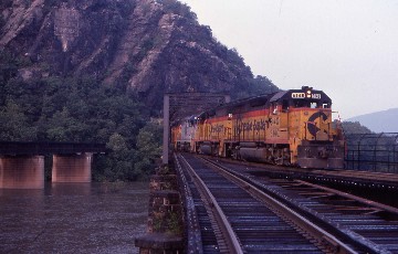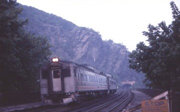I had a reservation at the Hilltop House so asked a merchant which road would lead to the hotel and off I went up a steep hill lugging my bag. I checked in and received a room on the second floor overlooking the town and the junction of the Potomac and Shenandoah Rivers, the point where the three states of West Virginia, Maryland and Virginia meet; it was a fantastic view. I freshened up and went to explore the area then hiked across the bridge to the Maryland side and climbed the ridge with the railroad and river far below. I stayed there for two hours with nary a train so it appeared that my lucky streak was over. The view was still spectacular and across the valley was the Hillstop House in its white paint. I returned to the station and seeing the schedules for both MARC and Amtrak trains, thought that I would be able to photograph them if I had an early dinner, so returned to the hotel and ordered a Southern fried chicken dinner which was excellent and watched an eastbound CSX freight. Afterwards, I walked back down the hill and was rewarded with four trains, the first being a MARC commuter train pulled by one of their F-units.